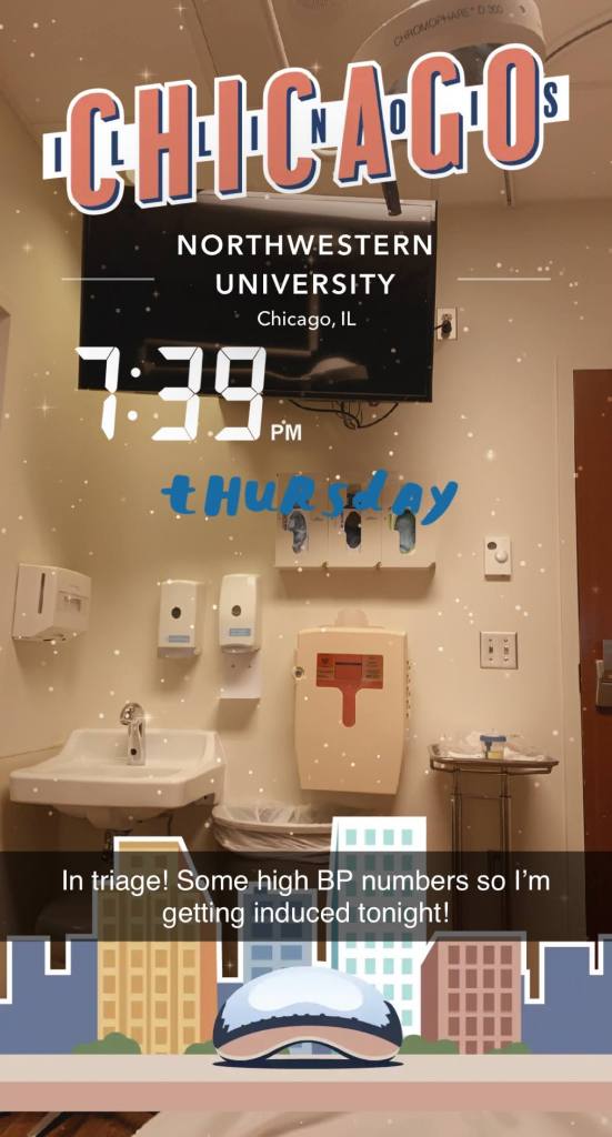 I take my blood pressure (BP) at home, as I have been monitoring it per doctor’s orders for the past 2 weeks, and it has been creeping up, and finally hit that 140/90 threshold which prompted a call to Triage. The doctor on call recommends induction, so Bill and I prepare to go to the hospital. We have been prepping Kalliszta for her new baby, and told her that Mommy and Daddy won’t be home for the next 3 days because we are going to the hospital to get the baby out. Luckily, my mom, Kalliszta’s Mima, has been staying with us for the past many weeks in part for this specific occasion and will stay with Kalliszta. I take a shower, we eat dinner, and around 11pm Bill and I head to downtown Chicago to Northwestern Prentice Women’s Hospital. At that hour, the drive only took 40 minutes. By midnight we are admitted to triage and I am hooked up to the blood pressure monitor that takes a measurement every 15 minutes, as well as the belly monitors that track contractions and the heartbeat. After 2 hours of good blood pressure readings, averaging about 120/70, and all labs of bloodwork and urine come back clean, I am released to go home. I guess there is something super relaxing about being in a hospital that caused my BP to go down? Bill and I are a little surprised, but also glad to have had this practice run.