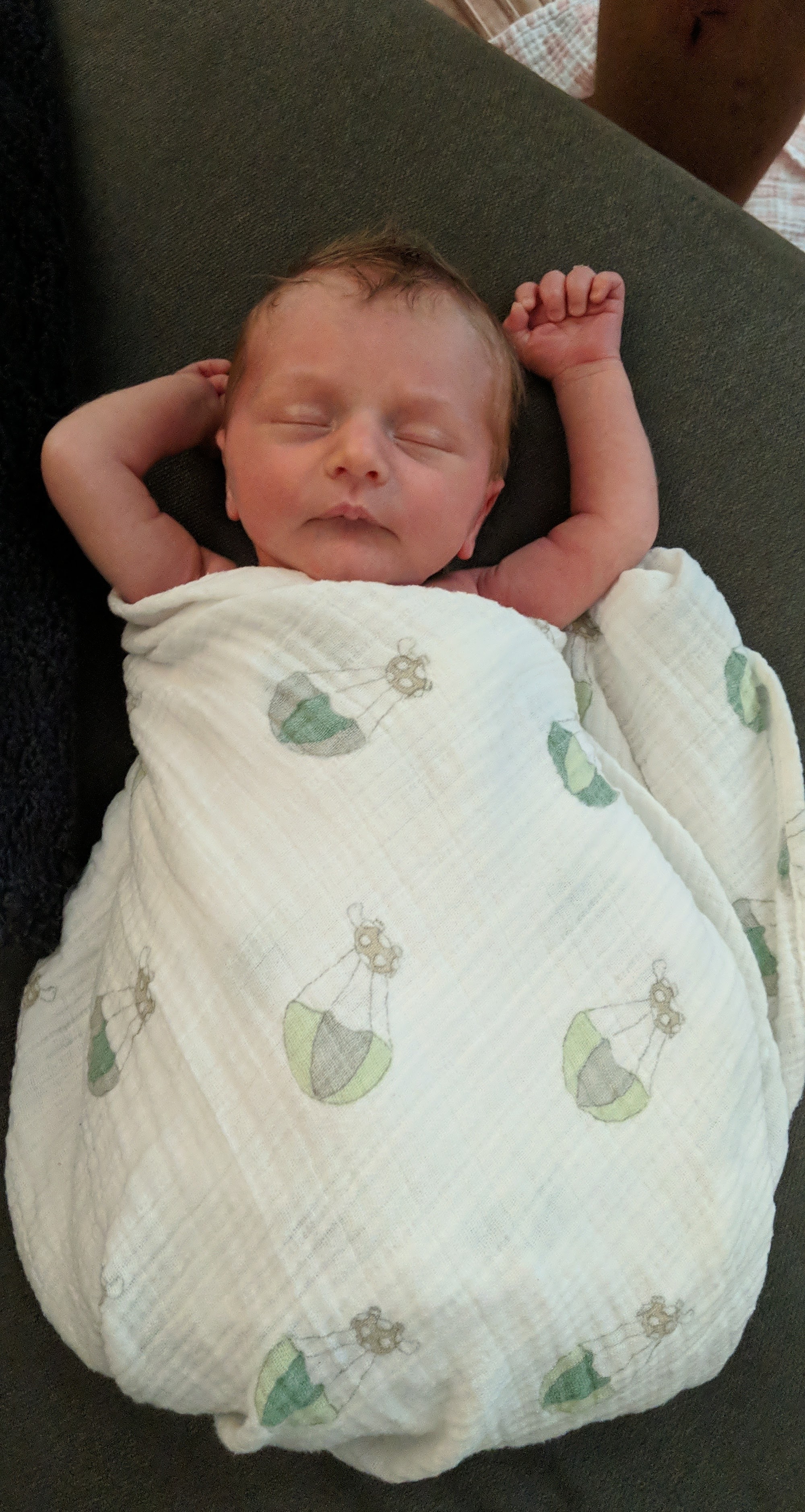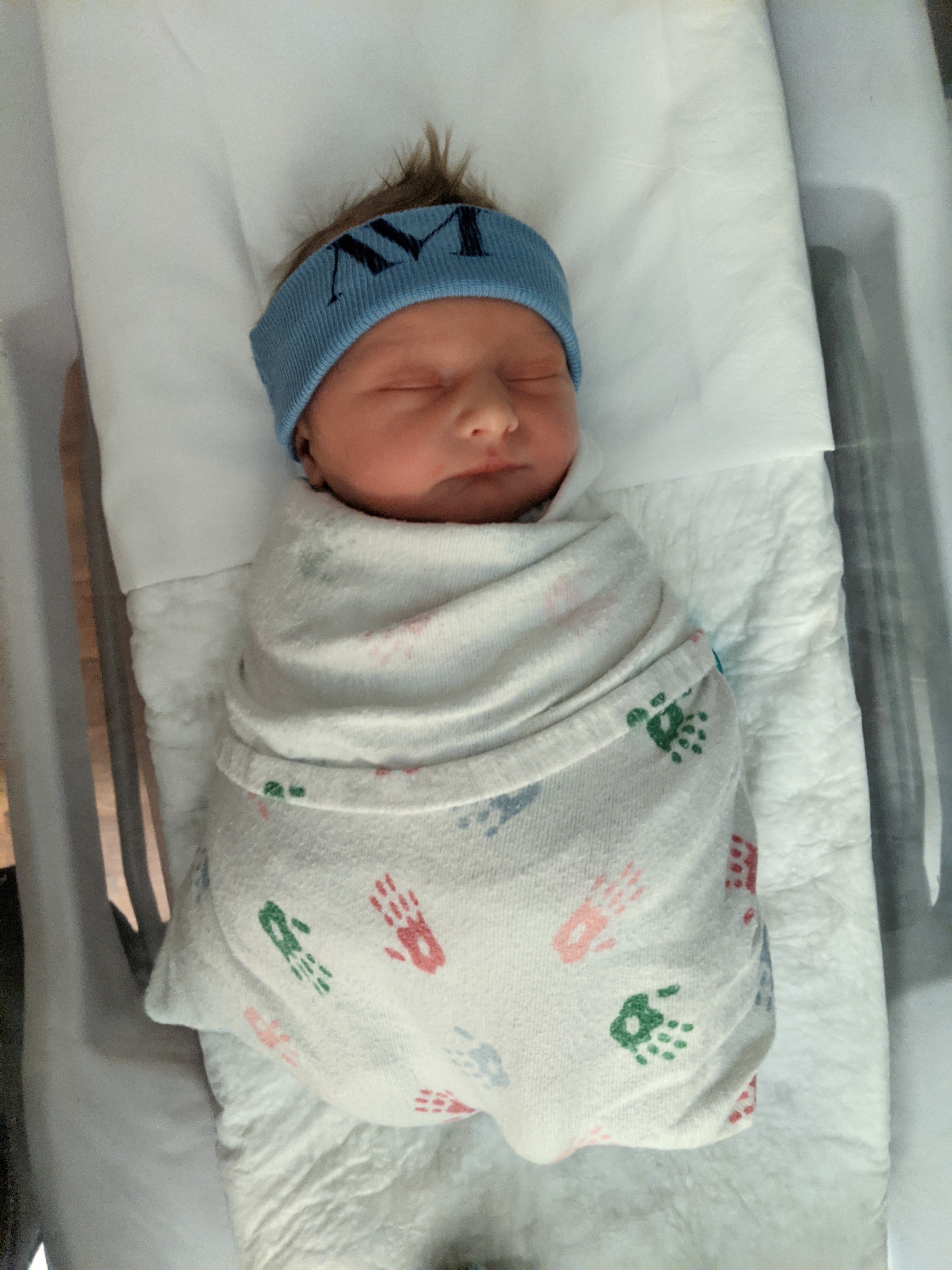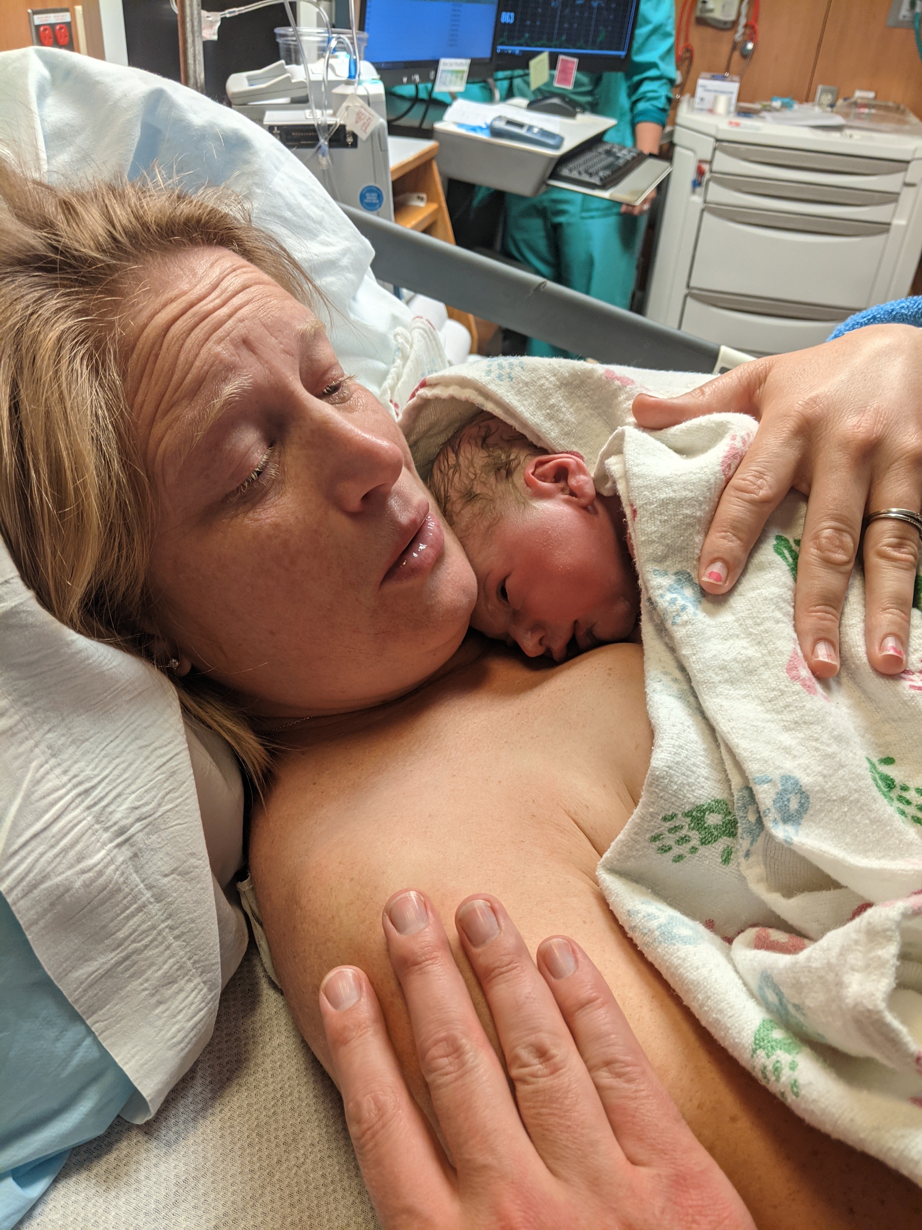 12 hours after arriving to triage – half the time it took with Kalliszta – we have an announcement: It’s a boy! 6 pounds 9 ounces! (6:09pm at 6lbs 9oz I love that!) Bence made his entry into the world, and I got to see it happen in the mirror! Dr. Nosal was awesome because once she came into the room my pushing got better with her very clear direction. Each push is 3 consecutive 10 seconds of pushing while blowing air out, but on my last push both Dr. Nosal and I knew this was it, and she said one more 5 second push, and then one more 3 second push, and then there he was! He was so cute and sweet and got to lay on my chest and snuggle right away, where he stayed for maybe an hour. I cried when they put him on me. And Dr. Nosal showed me all the good stuff that came out with him – his placenta (it was huge!) and umbilical cord, and whatever else. It was cool to see. About an hour into his life, Bence ate a tiny bit, and then got to snuggle with his dad. I think it was during this time that we decide on his name and texted our family the happy news. Bence is said in English like the word “fence” or common “sense” but with a B!