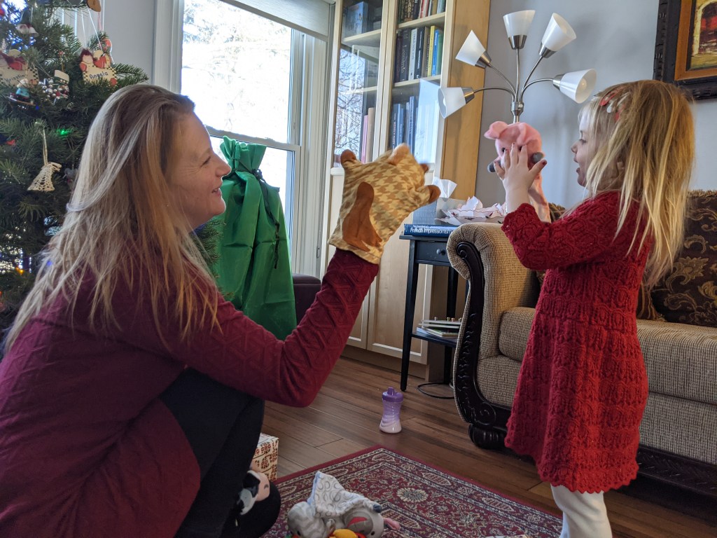 In November, we celebrated Kalliszta’s 3rd birthday with a family-only party at Mima and Nagypapa’s house and then had a gymnastics birthday party through the parks district that weekend with her friends from her classes. The kids had a blast running around the gymnastics gym for an hour doing whatever they wanted, and the parents were glad their kids got all that energy out! We enjoyed a Jojo Siwa cake and homemade cookies (thanks Mima!). We started the holiday season off early with a day trip to Chicago with the O’Finns to check out the Christkindlemarket and the fun sites of downtown the day before Thanksgiving. It was a great day despite not getting any good family photos, and I hope to continue that new tradition (of going to Chicago, not the part about not getting a good picture)! The day after Thanksgiving was Grandpa Bob’s birthday, which we celebrated by visiting the Christmas tree farm and helped our grandparents pick out their trees.