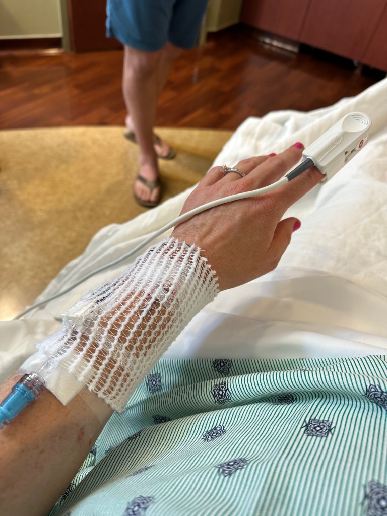 We arrived at the hospital. They put me in my room and got my IV in on the top of my wrist. This is always painful for me and it was not much better this time. They checked my cervix and I was actually dilated, 3.5 cm. They hook up a hydration bag and pitocin to the IV and started the pitocin at level 2.