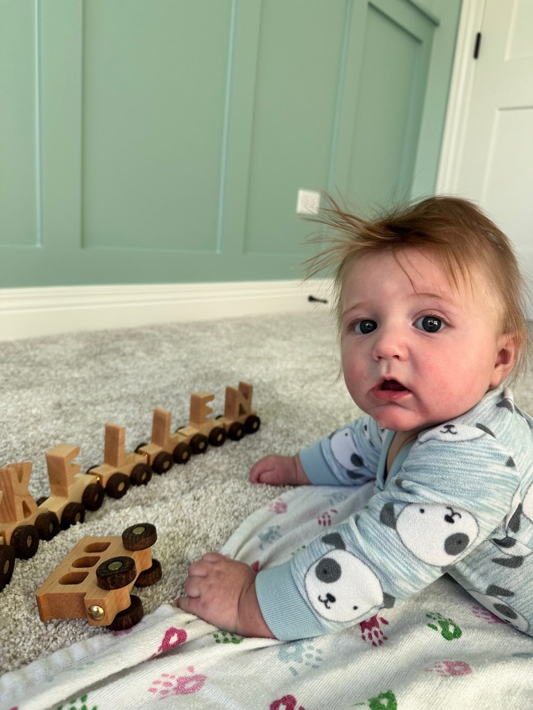 Aaaaaaaand now it is the day before his first birthday, so I better get this published by tomorrow! Kellen is napping in his own bed, which is quite rare for him as the third child. But lotâs of things are different for him as the third kid. He watched TV as early as a few weeks old thanks to his siblings watching TV. His oldest sibling was probably 2 years old when we first turned it on. He loves Bluey and Handyman Hal and watching soothing sand art videos. He also sits in the baby swing outside on our playset for a long time because it is an easy spot for me to put him when I need to do something else and I can’t keep my eyes on him long enough for him to not crawl away. We also have a âbaby jailâ (a baby gate circle playpen) in the family room where we put him if we are inside which serves the same purpose as the babyswing. He is such a fast crawler – he prefers the bear crawl because he tries to keep up with his siblings. He gets VERY upset if they run too fast for him, he does not like getting left behind the group! He is just days away from walking. I was hoping he would take his first real steps on Motherâs Day, but it seems neither of us can meet a self-imposed deadline. He loves to laugh – especially with Kalliszta – he is just so silly. He loves to play in water and give himself a round of applause. He looks so much like his siblings I have to double take some baby pictures! He is just perfect and sweet, and fought off RSV and an ear infection (thanks to medicine) and heâs got such cute teeth that he loves to brush. He is so smart and is such a good sleeper. I love our bedtime cuddles on the rocking chair in his room as he drinks his bottle. Heâs down to just one nap a day, if he gets to sleep in his bed that is. He almost always naps in the car seat, as I tote his older siblings around between pre-K and preschool drop off and pick up and play dates and gymnastics and t-ball and all the other activities we have going on as a household with a 5 year old and a 3 year old. Kalliszta is at her last full day of pre-K as I write this now, and since Bence already finished his year at Two Cool For School Preschool, he is watching TV so I can write this blog. I have about two hours before Kellen wakes up again. Good thing I have this whole blog written in my head, I just have to get it on the pageâŠÂ